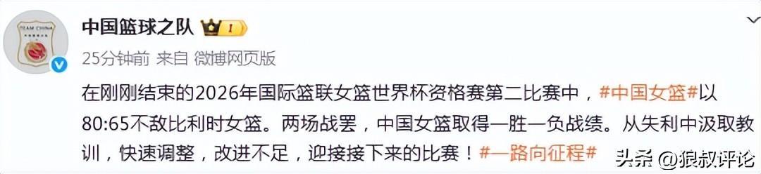 北京时间3月12日,女篮世预赛,中国女篮65-80不敌比利时女篮,战绩为1胜1负。